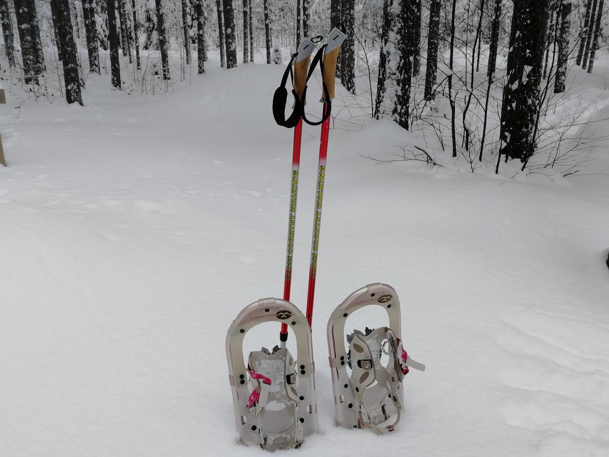 Kulkuvälineiksi tarvitset lumikengät ja sauvat (isosompaiset toimivat umpihangessa parhaiten). Majalta on lainattavissa muutamia aikuisten ja lasten lumikenkiä sekä sauvoja.